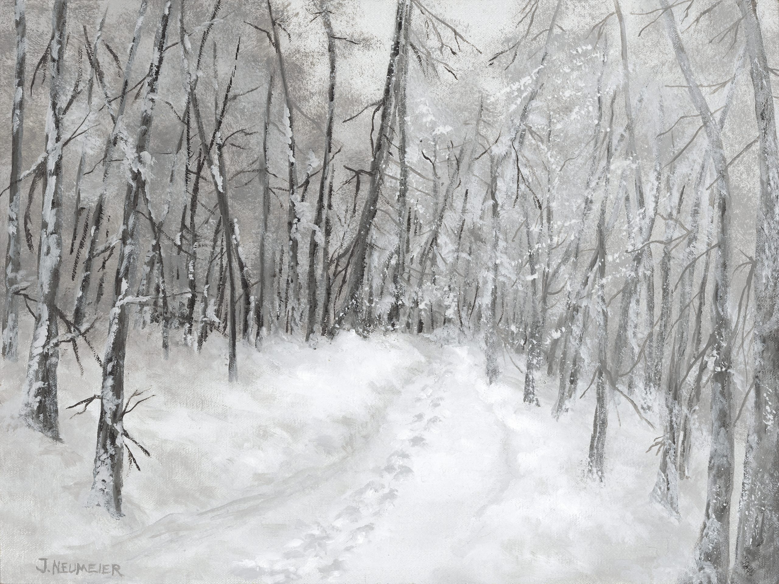 Smaller size – 12″ wide x 9″ tall, Black and White Oil painting on Belgium linen wood panel.